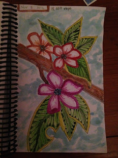 These sketches were done while sitting and looking down below off the deck, from the front room into the kitchen and of flowers found around town (idea wise, not visually). I am trying to do a sketch a day (or zentangle) while we are on holidays. This sketch book is just regular paper so I can't mix, blend or bleed out my water colours on the paper. The coloured areas feel more like a colouring book than actually painting. The bottom two were done while Brian was reading aloud 3 more chapters of the children's book "How Hammershod Got His Name" that he wrote.